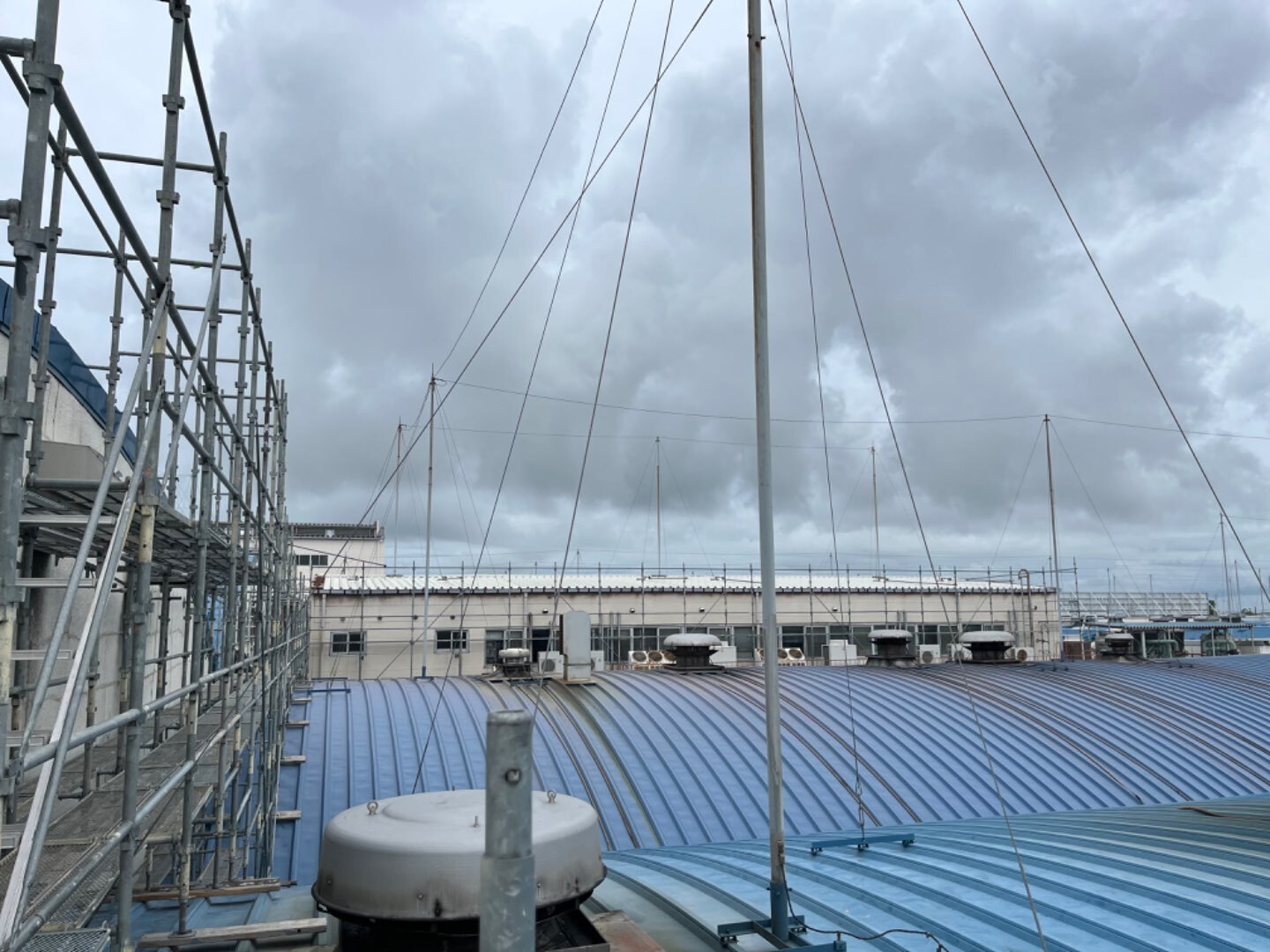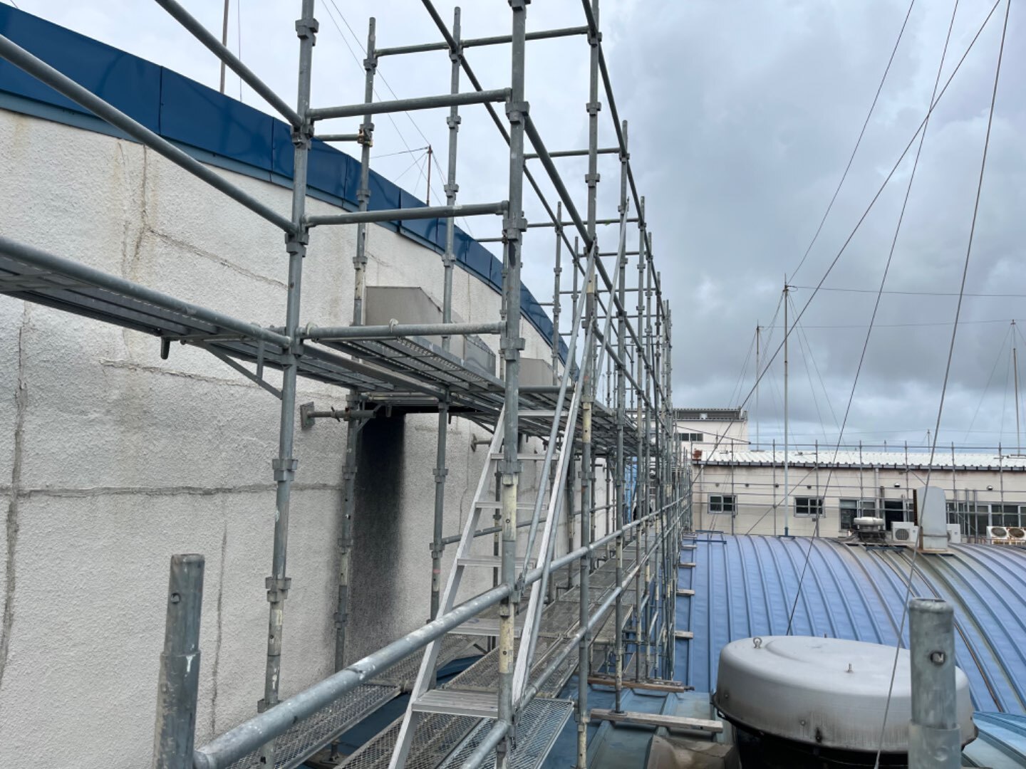 外部足場とR屋根の灯り取りの屋根足場設置でした。