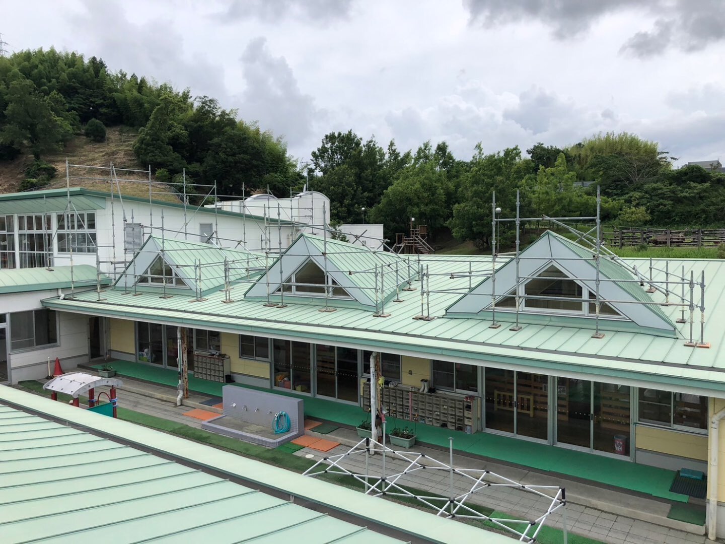 同日、幼稚園の屋根補修用の屋根足場を組みました。