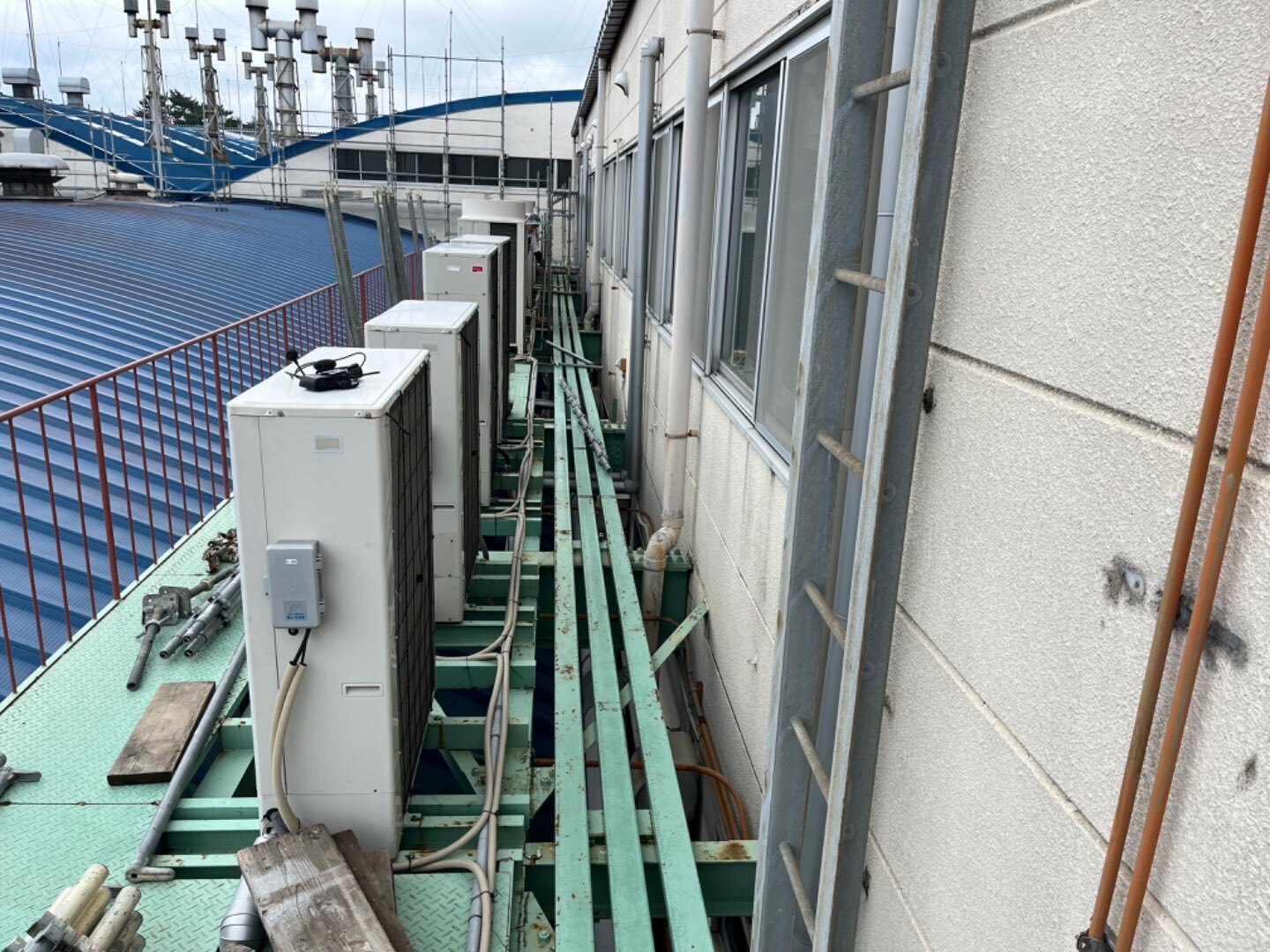 当社では先週末、工場の改修工事と某幼稚園の屋根補修工事の足場を組みました。