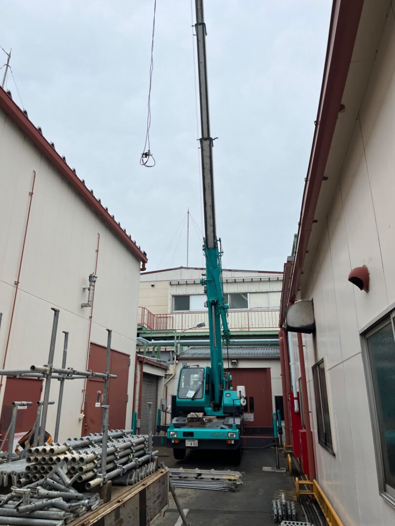 工場の改修工事は複雑な屋根上に足場を設置する作業となりましたので、レッカーを使用して荷上げしました。